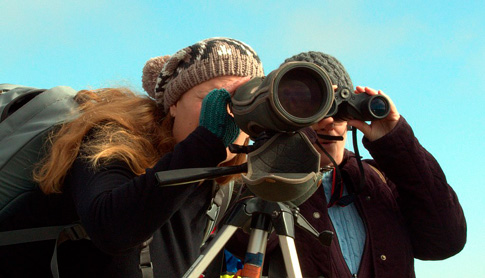 Два исследователя смотрят в даль через зрительную трубу и бинокль